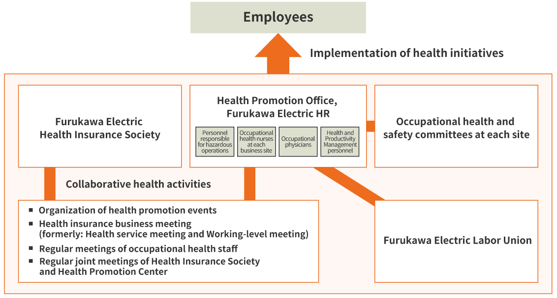 At the Company, we have formed the “Collaborative Health Promotion Team” in collaboration with the Furukawa Electric Health Insurance Society. We hold regular meetings to discuss coordination between the Company’s health promotion activities and the health insurance society’s programs, as well as meetings to incorporate the opinions of occupational physicians and nurses. In addition, in collaboration with the “Health Events” business of the Furukawa Electric Health Insurance Society, each Furukawa Electric corporate works and branch office implements various innovative health promotion activities.