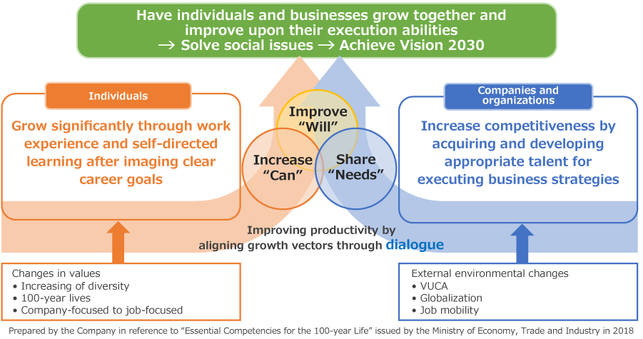 We are developing a narrative that envisions building an organizational culture where individuals can continue to thrive with a strong sense of purpose. This involves assembling the talent necessary to execute our management and business strategies, forming an effective organization, and supporting the growth of each individual so they can perform to their full potential. We frame this approach around three key elements—Will, Can, and Needs—and are undertaking specific initiatives based on these elements.