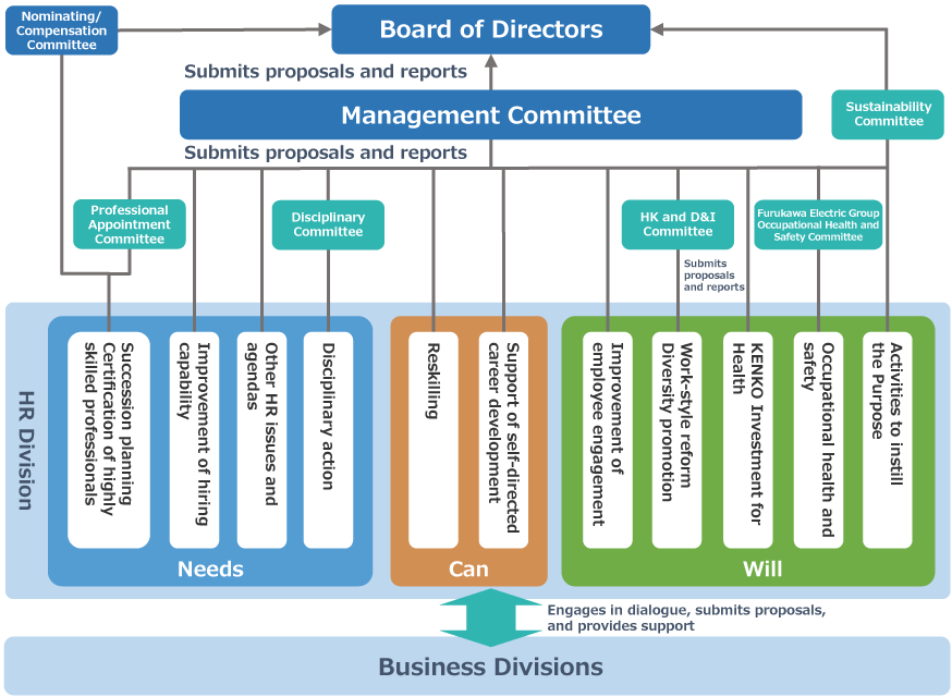 For individual theme directly related to management issues, we establish committees chaired by the president or CSO to formulate strategies, determine activity plans, and promote implementation of measures“—Professional Appointment Committee” to certify highly specialized personnel, “HK* and D&I Committees” to promote work-style reform, diversity & inclusion and other measures, and Furukawa Electric Group Occupational Health and Safety Committee” on occupational health and safety.